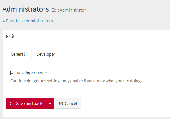 After an administrator is created, the “Developer mode” can be enabled for them. When that option is checked, some advanced options are enabled for that user in the administration panel: